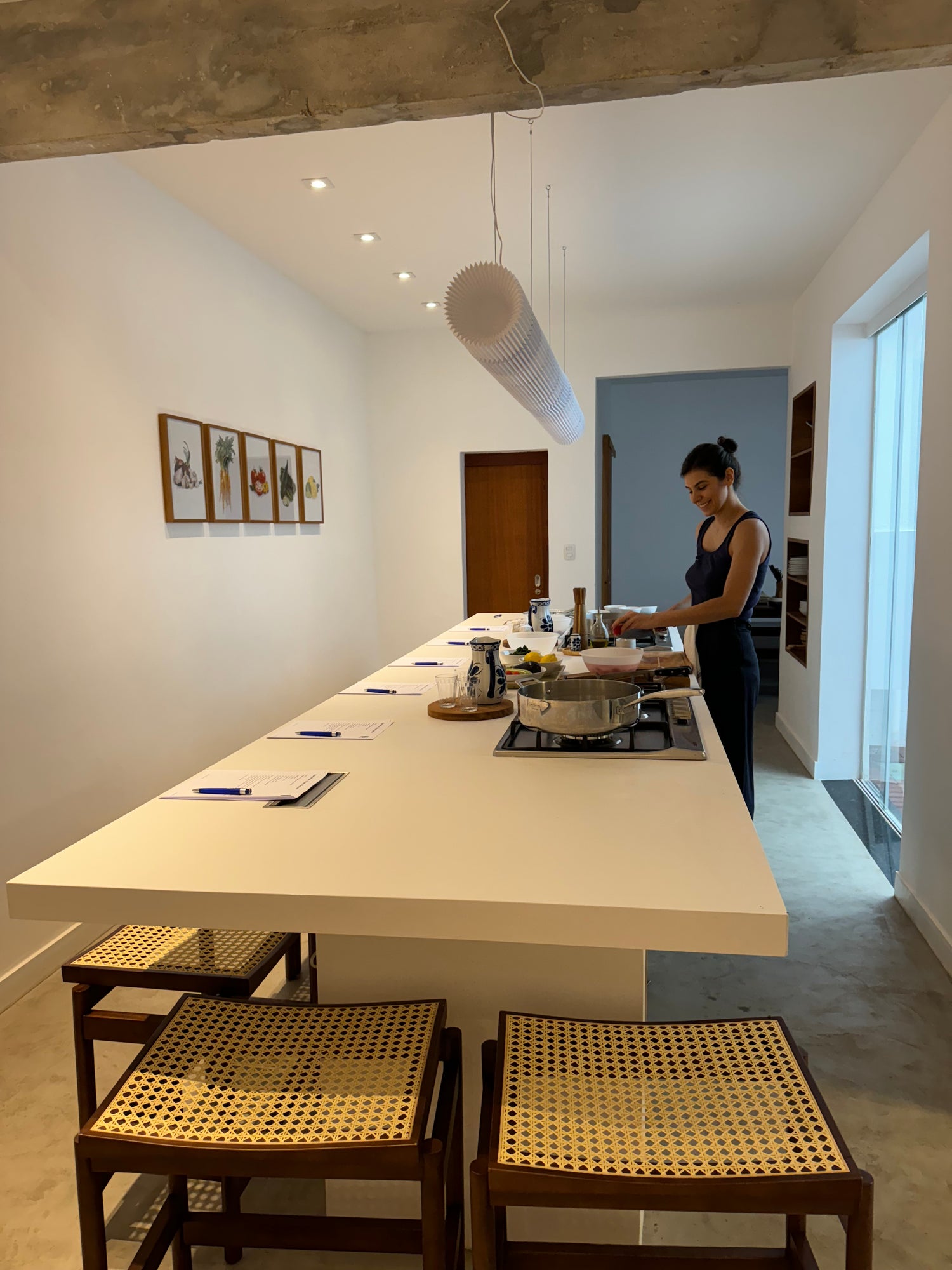 A cozinha foi projetada para aulas expositivas e práticas. Temos uma ilha no centro do ambiente com 2 cooktops, onde a Ju guia as aulas, com 10 assentos confortáveis em volta.