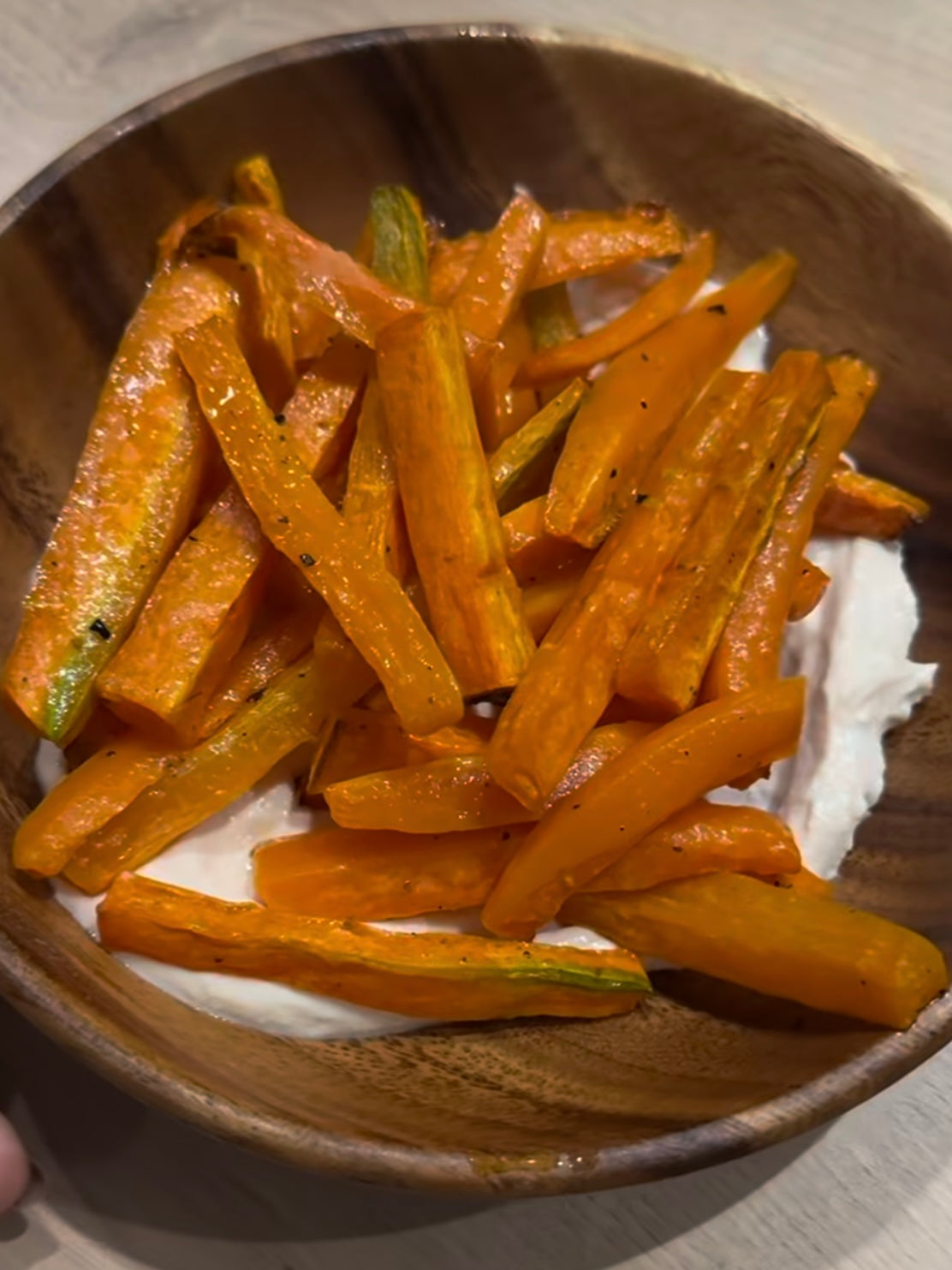 - Tempere a cenoura com azeite, sal e pimenta e leve ao forno ou air fryer a 180ºC por aproximadamente 15-20 minutos,